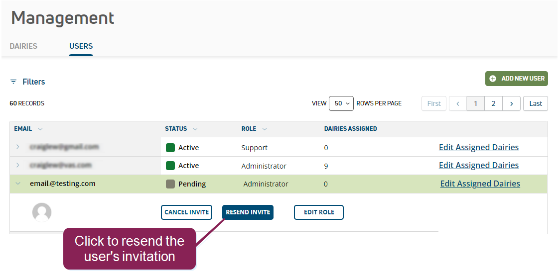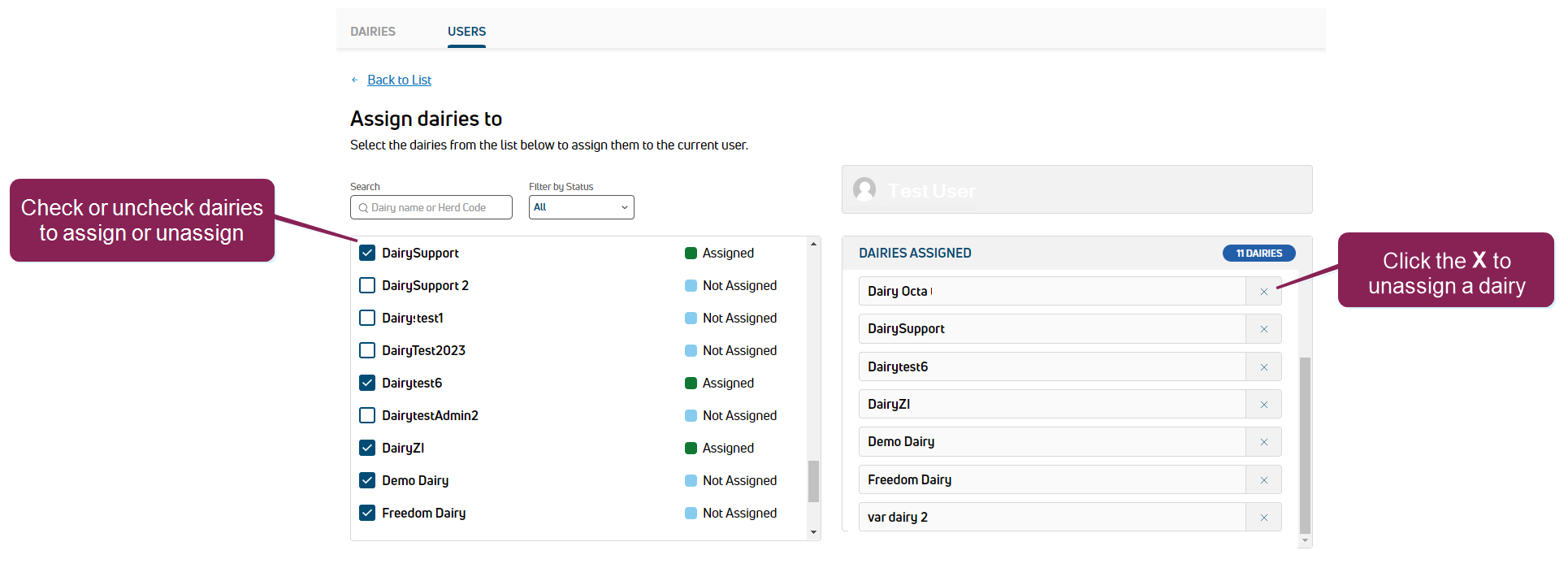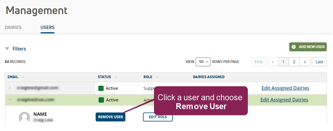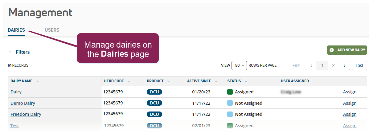 The Users page allows you to add and remove users, as well as adjust a user's assigned dairies.