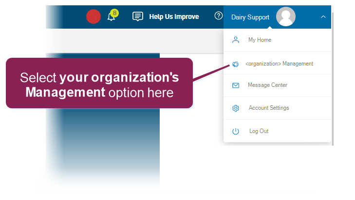 To access the Dairy Support Management Tool, log into PULSE and select your organization's Management option from your user menu at the top right of the page.